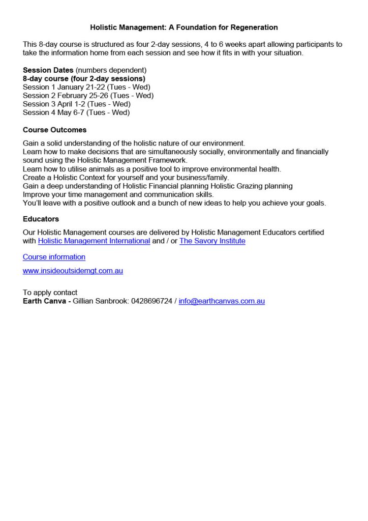 Gain a solid understanding of the holistic nature of our environment. Learn how to make decisions that are simultaneously socially, environmentally and financially sound using the Holistic Management Framework. Learn how to utilise animals as a positive tool to improve environmental health. Create a Holistic Context for yourself and your business/family. Gain a deep understanding of Holistic Financial planning Holistic Grazing planning Improve your time management and communication skills. You’ll leave with a positive outlook and a bunch of new ideas to help you achieve your goals.